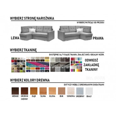 Narożnik możesz zamówić w dowolnej tkaninie. Dostępne materiały znajdziesz w zakładce Tkaniny. Możesz łączyć różne kolekcje tkanin - np. siedzisko wykonać z materiału, a dodatki z ekoskóry.