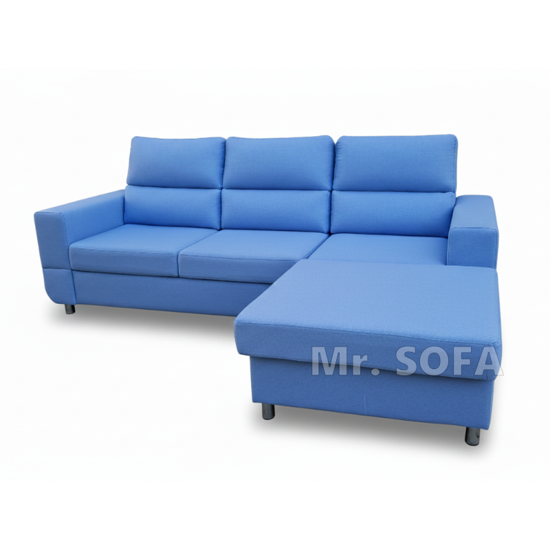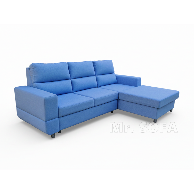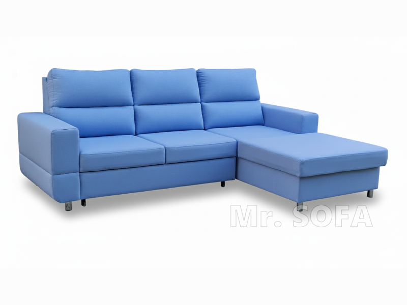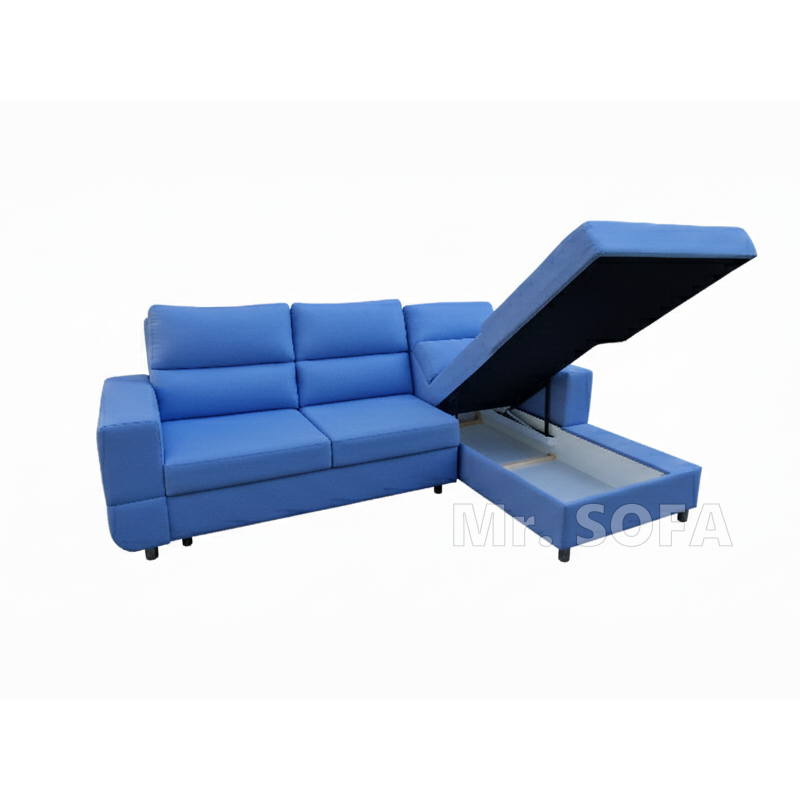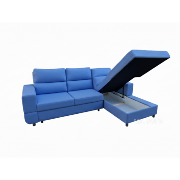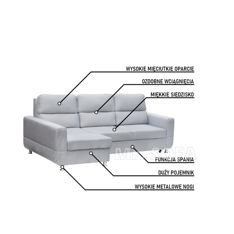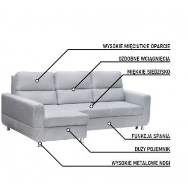 Duży narożnik z regulowanymi zagłówkami. Nowoczesny styl wpisuje się w aktualne trendy. Siedzisko tego narożnika jest miękkie, siadając delikatnie się w nie wpada. Oparcie jest tak wyprofilowane, aby dolna część pleców była wygodnie podparta. Pod boczną częścią narożnika znajduje się pojemnik na pościel, a spod siedziska wysuwa się spanie.